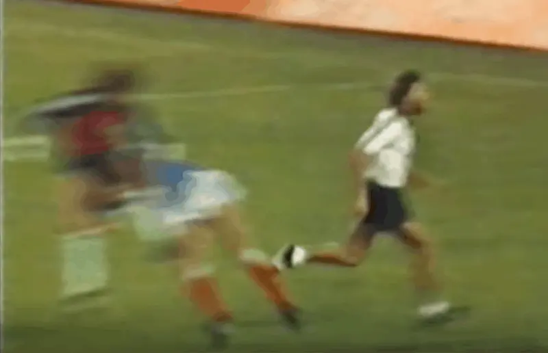 For some reason – probably not even Johnson knows why – he decided to put his head down like a charging billy goat and ran headfirst into Germany legend Maurizio Gaudino. He sent his unfortunate victim sprawling onto the ground and then the floppy-haired maniac got up and ran away with a psychotic look at the cameras. Iconic.