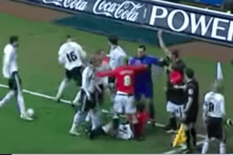 This one was so bad that Menapi should have seen two red cards. The ball was on the ground, but Menapi was in the air as he flew into Riki Van Steeden, breaking the unfortunate player’s leg. He was hit with a 6-match ban for the incident. Sadly, he’d die four years later at the age of 40.