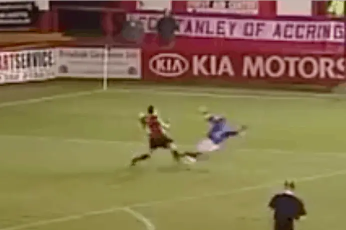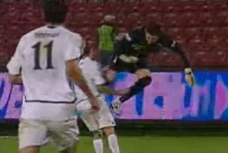 Georgian Paun was running through on goal when Claro decided to charge out of the box and karate-kick him in the chest. The momentum of Claro as he slammed into Paun was ridiculous. He instantly got sent off – despite his hilarious attempts at playing down what had just happened. You’ve almost got to love it.
