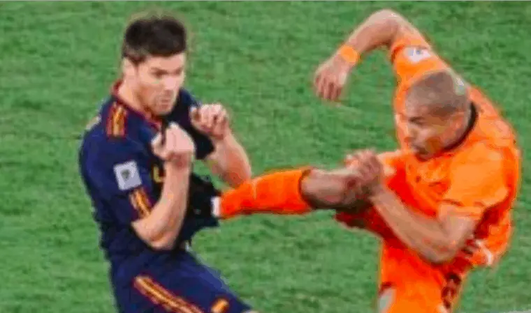 While Mark Van Bommel must have fouled every player on the pitch at least once, it was Nigel De Jong who stole his thunder. Right in front of referee Howard Webb, De Jong literally karate kicked Xabi Alonso in the chest. We’re talking full-on assault. He got a yellow card for his blatant high-foot. Talk about endangering your opponent…