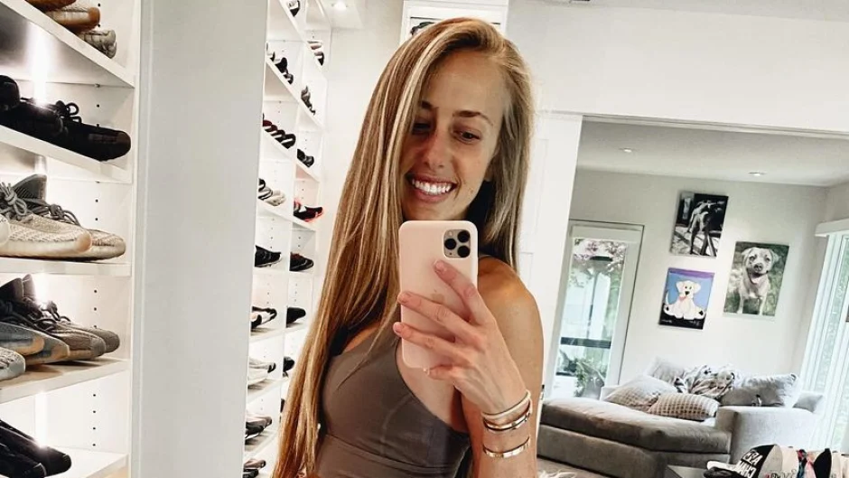 Aquí posa con la colección de zapatos de Mahomes. También podemos ver varias obras de arte en la pared detrás de ella. Hay un par de fotos de perros porque al dúo le encantan sus perros. Brittney también tiene una sonrisa enorme en la cara porque está viviendo sus sueños más alusivos(via Heavy).