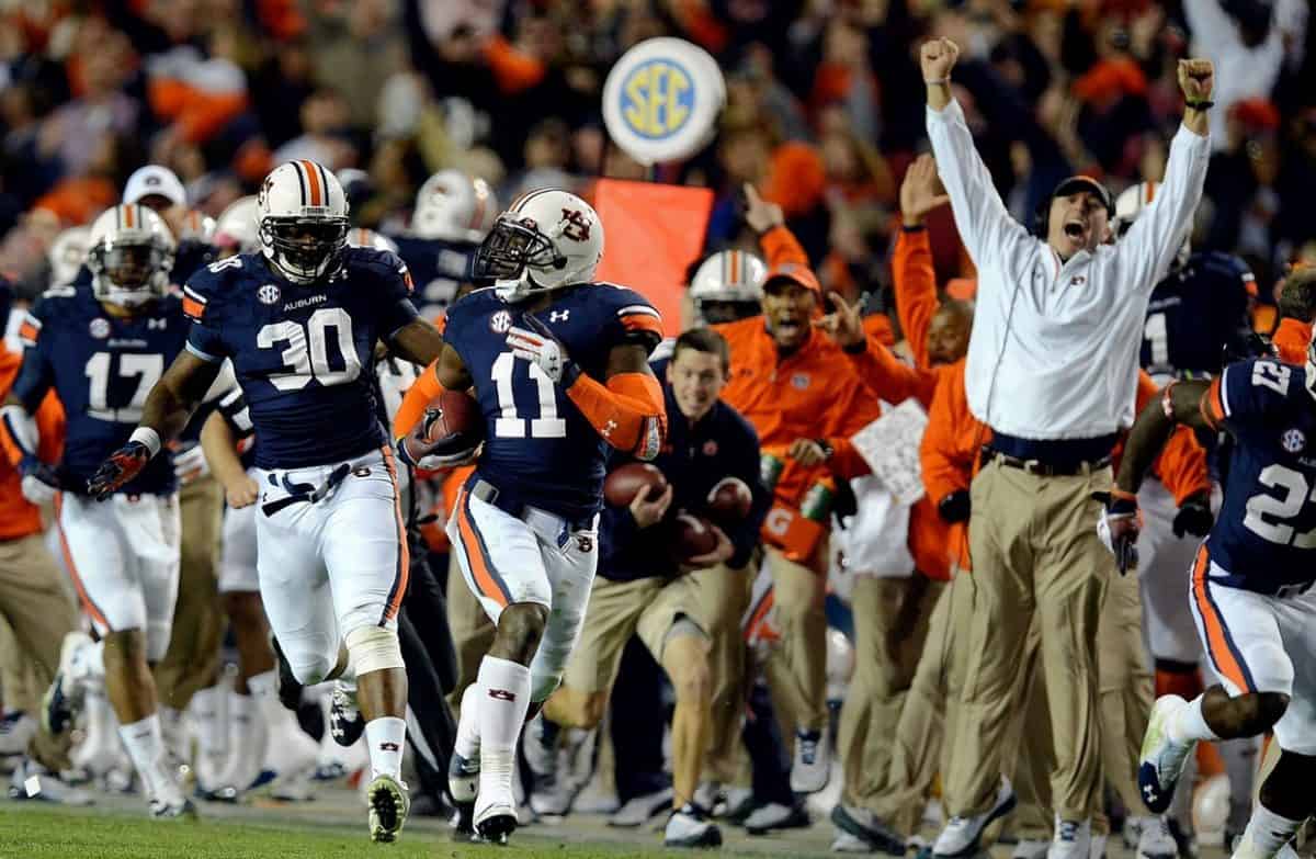 Auburn came from behind twice to tie the game but it looked like Alabama was finally going to win with a field goal. But the 57-yard-kick was short and Auburn star Chris Davis ran the entire length of the field through players of both teams to score the most unlikely touchdown. Many believe that this is the greatest play in college football history and it’s definitely up there.