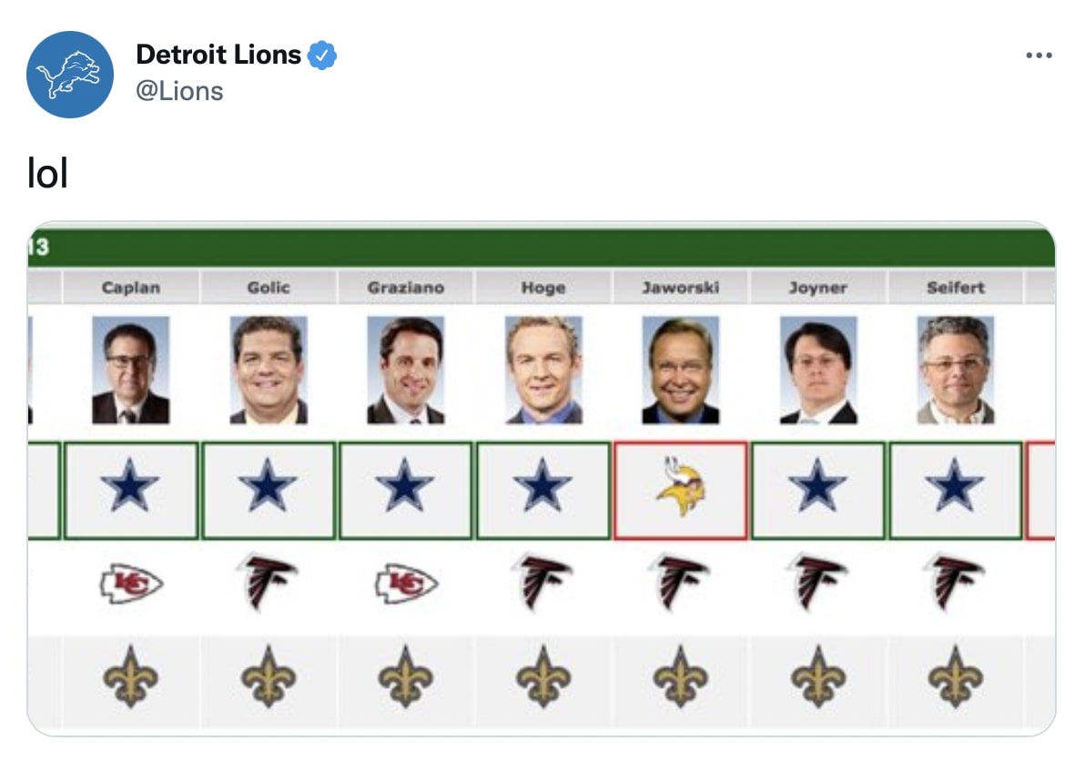 All of their analysts selected the Saints to beat the Lions in New Orleans. However, Detroit belied their underdog status and seized the victory. Then their official Twitter page released a hilarious statement that consisted of a single emoji. Words weren’t necessary as they trolled the TV network (via USA Today).