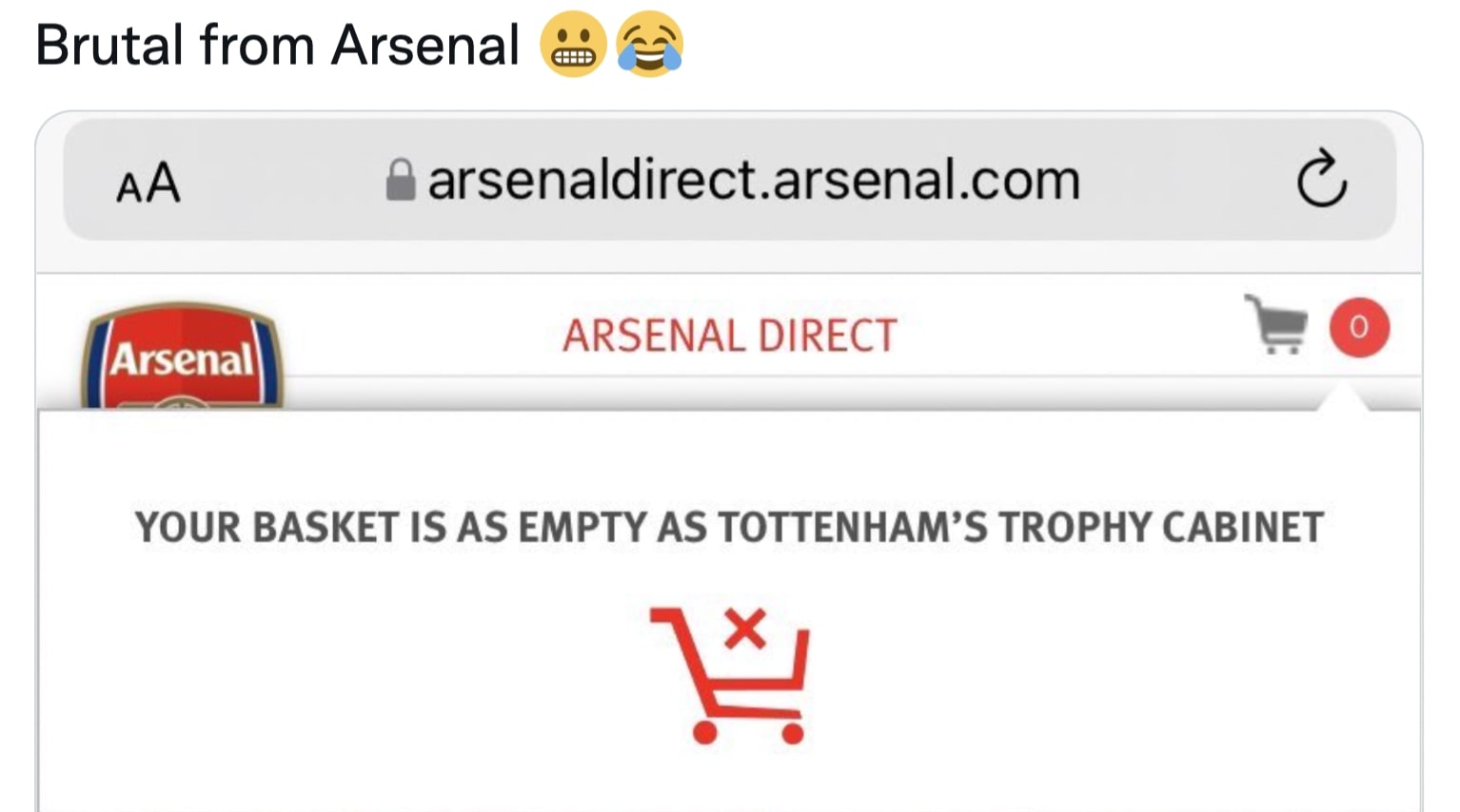 Go onto Arsenal’s online store but don’t select anything. Then open the empty card and read the following message. It says: “your basket is as empty as Tottenham’s trophy cabinet.” They trolled their enemies in a brutal and petty fashion. The site’s administrator deserves a raise because this is brilliant.