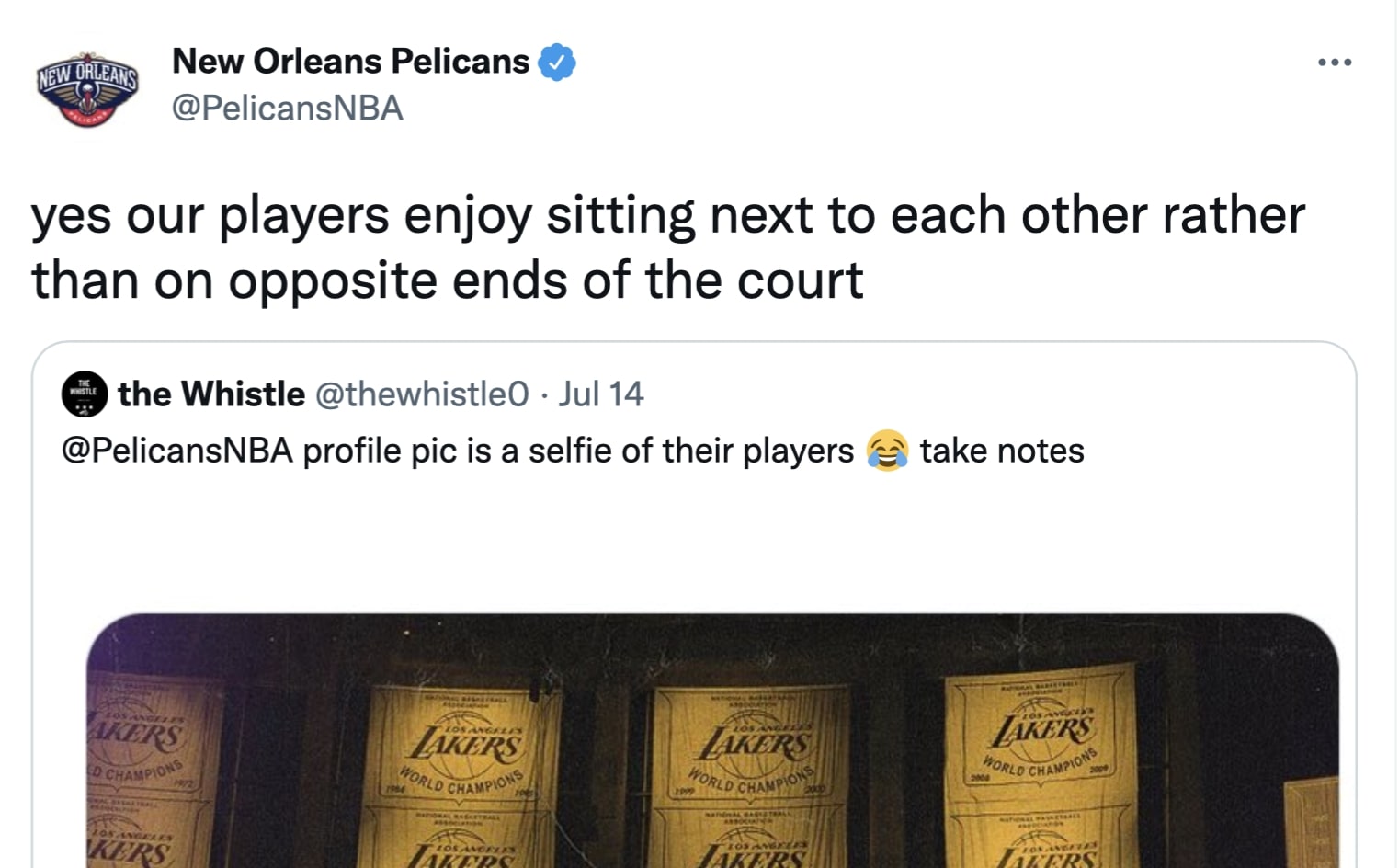 A Lakers fan page mocked the Pelicans because their official Twitter account’s profile was a selfie of their players. Then the Pelicans responded with a brutal putdown as they said that at least their athletes like each other. It was an intense dig and one that reverberated around the league.